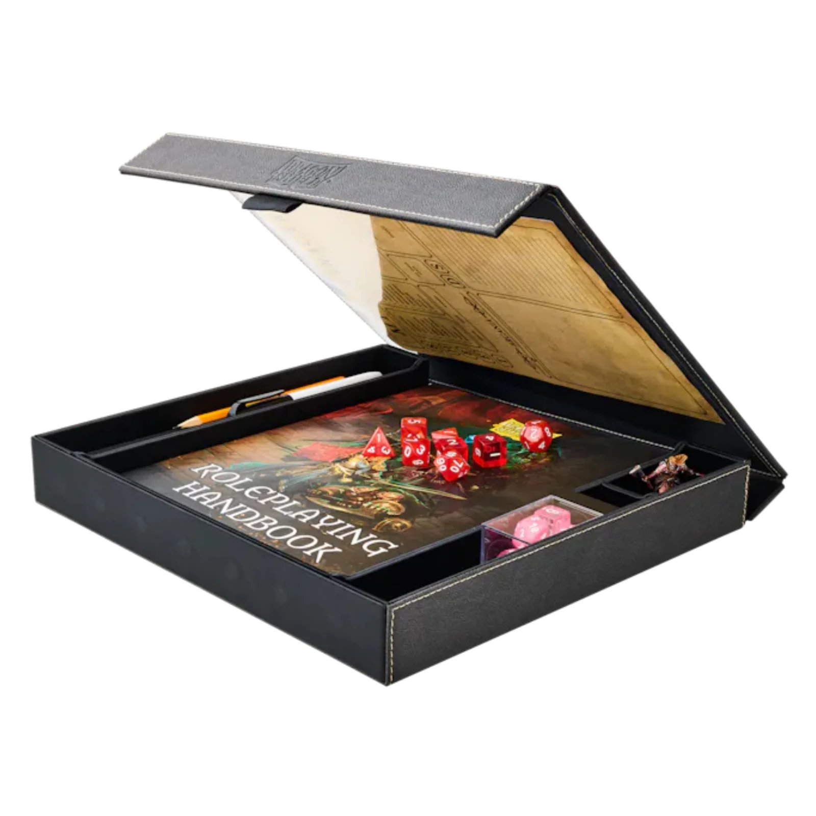 Изработен со издржливоста на речиси вистински Dragon Skin, овој Companion не е само кутија. Со простор за минијатури, коцки, моливи, cahracter sheets, мобилни, таблети, ни овозможува сè да ни е прегледно, без разлика дали сме во комбат со опасен монстер или во дискусија за решавање на политички интриги во Waterdeep. Време e за Greatsword, Eldritch Blast, Perception, Action, Slight of Hand, Athletics, и пријателов се претвора во dice tray на critical hits.