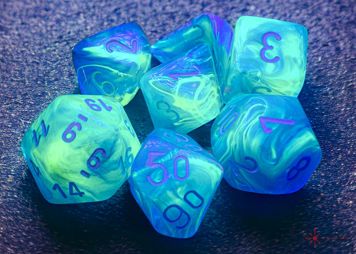 Сет од 7 коцки: D4, D6, D8, D10, D12, D20, D%